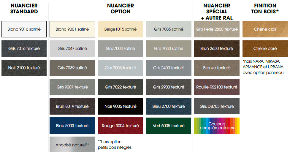 Exprimez votre style grâce à notre large palette de couleurs garanties 10 ans. En standard, choisissez parmi 3 couleurs : Blanc 9016 satiné, Gris 7016 texturé et Noir 2100 texturé.